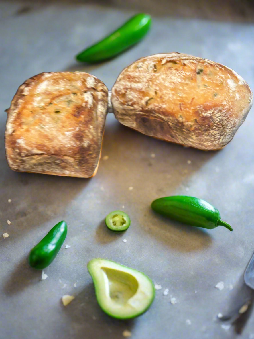 Turn up the heat with our 9” Jalapeño & Cheese Sourdough Loaf. Naturally fermented with our original sourdough starter and baked to perfection, this loaf brings together the tangy flavor of sourdough, the bold kick of fresh jalapeños, and the rich creaminess of melted cheese.